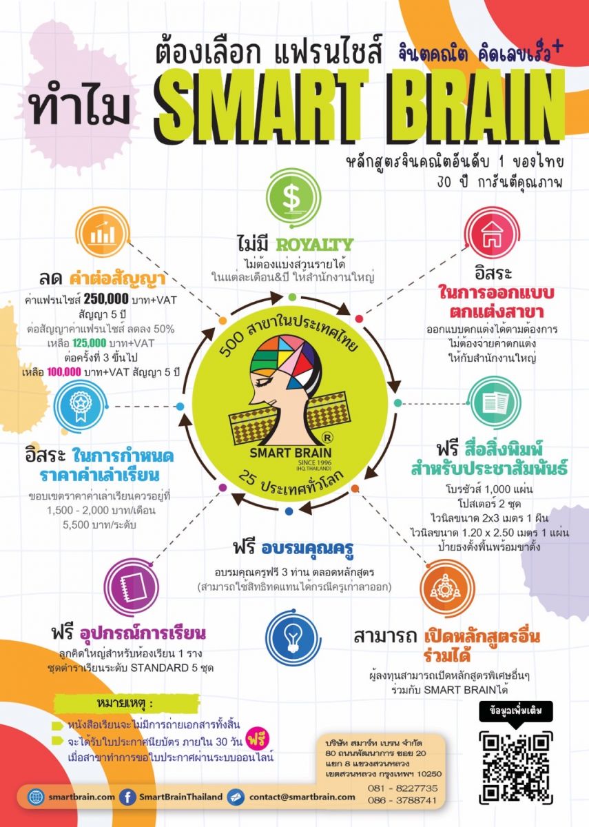 Smart Brain was established in Thailand in 1996. Now our name is recognized worldwide. Smart Brain is working for the development of children’s brain. Smart Brain’s simple and proven step-by-step guidance and motivational teaching system effectively activates our students’ own untapped talent and mental power. Their capability is also developed and established earlier so that they perform faster than others of the same age.