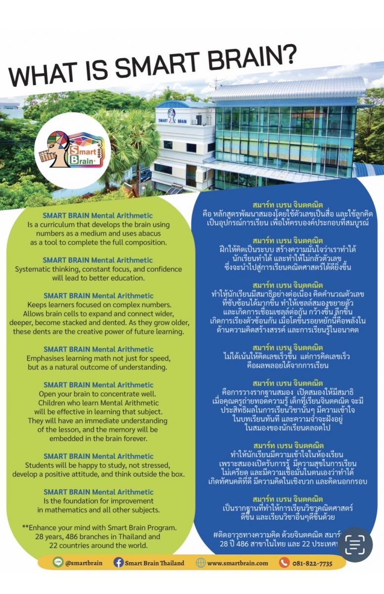 สมาร์ท เบรน คือ หลักสูตรเสริมทักษะจินตคณิต เพื่อพัฒนาการทางสมองและสมาธิต่อเนื่องขั้นสูงสุด เป็นการบูรณาการพลังสมองครบทั้งสองฝั่งอย่างเต็มระบบ ให้ทำงานผสานกันอย่างเปี่ยมประสิทธิภาพสูงที่สุด เนื่องจากสมองของเด็กในวัยนี้ กำลังเจริญเติบโตอย่างเต็มที่ หลักสูตร สมาร์ท เบรน จึงเหมาะอย่างยิ่งสำหรับการเริ่มต้นพัฒนาเด็กตั้งแต่ชั้นอนุบาลและเด็กประถมต้น หลักสูตรสมาร์ทเบรนผ่านการรับรองจากกระทรวงศึกษาธิการมาตั้งแต่ปี 2539 จนถึงปัจจุบันได้รับการพัฒนาปรับปรุงและเปลี่ยนแปลงโครงสร้างหลักสูตร ให้สอดคล้องกับวิวัฒนาการทางการศึกษายุคใหม่ตลอดเวลา