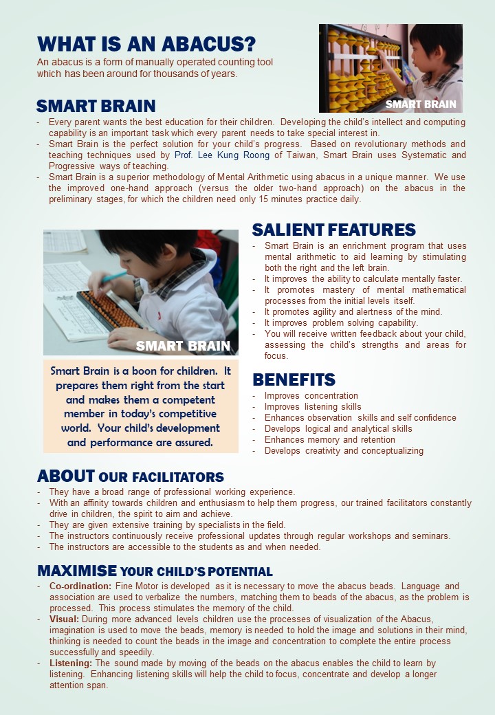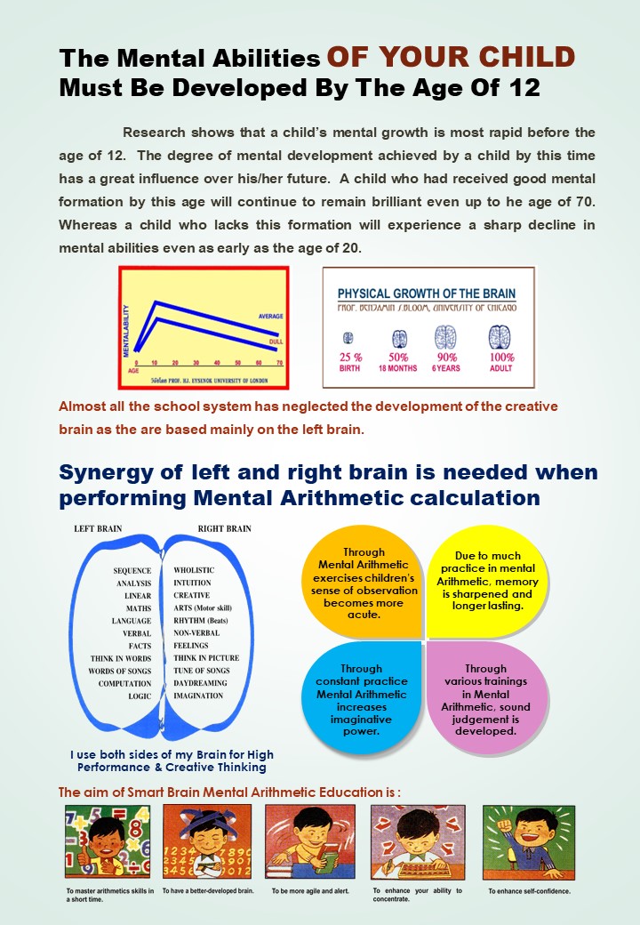 Smart Brain is a mental arithmetic program which develops both sides of the brain that work systematically to produce the highest performance in children studying in the primary level.