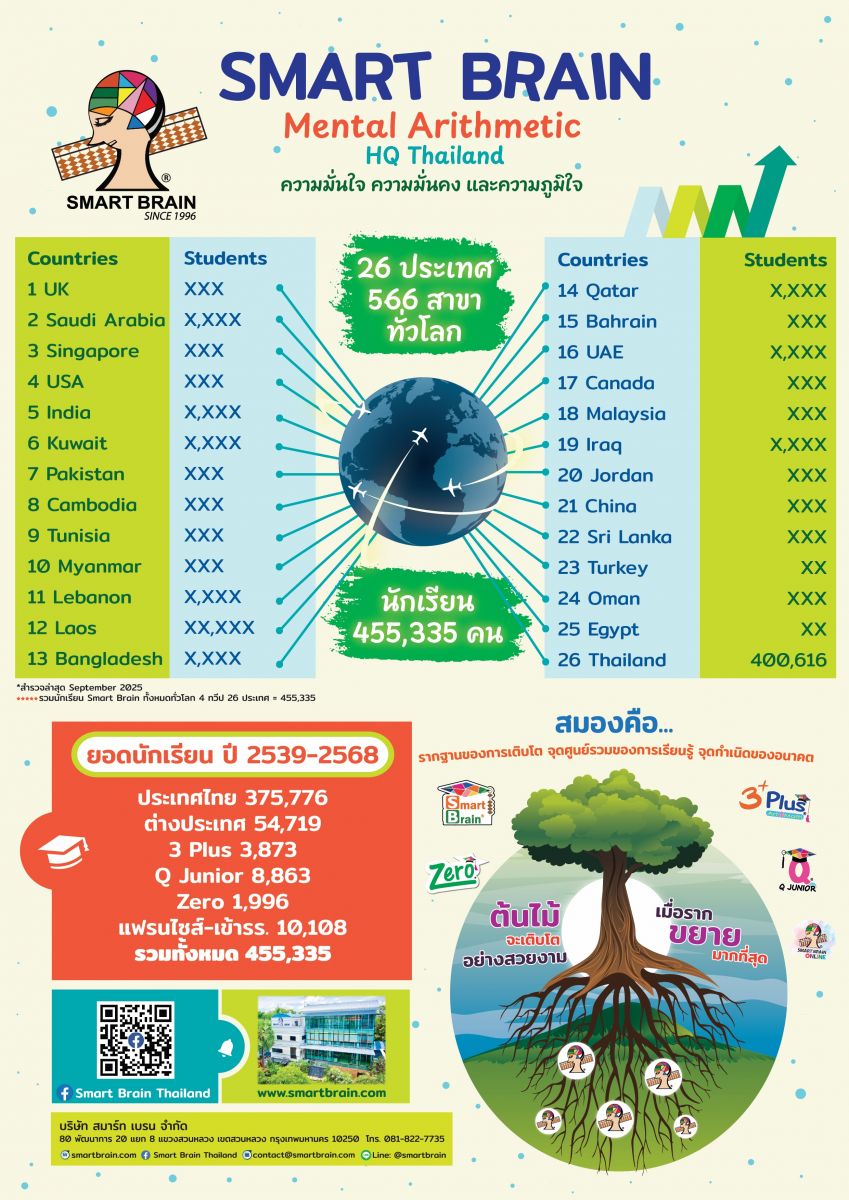 ด้วยมืออาชีพกันนะคะ สมาร์ท เบรน ขอรับประกันด้วยหลักสูตรคุณภาพที่มีผลงานมากว่า 3 ทศวรรษ ในการบริหารพัฒนาการเด็กห้าแสนกว่าราย ที่ใช้อยู่ในต่างประเทศถึง 22 ประเทศ และเกือบ 500 สาขาในไทย"